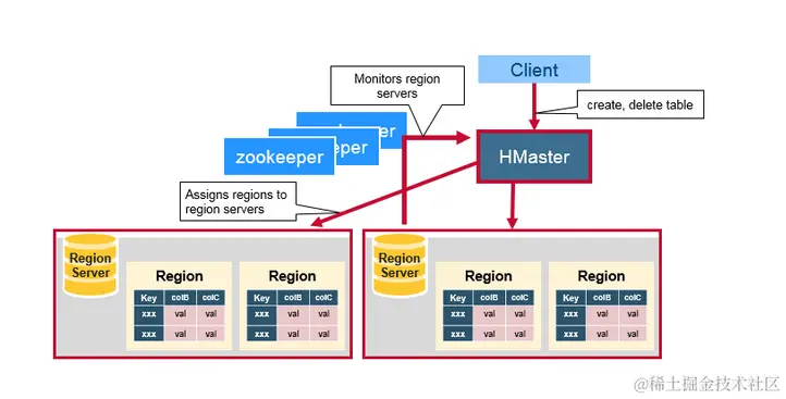 HMaster在hbase中是属于一个leader的角色,不参与具体表数据的管理,只负责宏观把控,主要工作内容有两方面,一个是管理Region server,另一个就执行一些高危操作,比如执行DDL(建表,删除表等)。