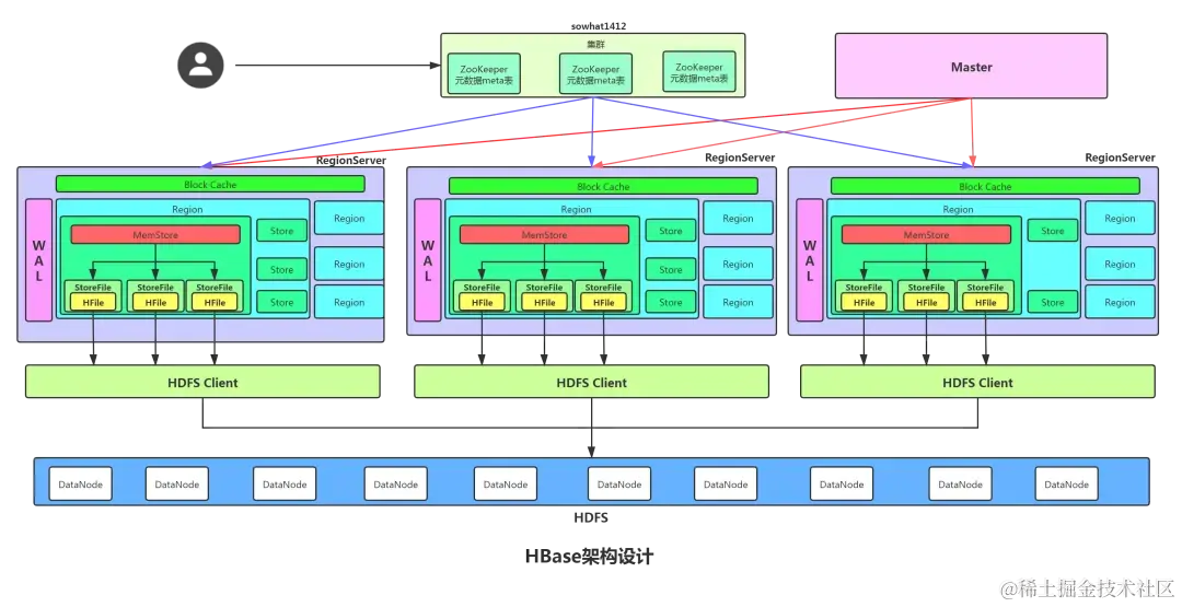 HBase架构整体上分为3个部分Zookeepper集群,HMaster以及Region server。架构图看上去还挺复杂的,但是最核心的是region server,后边会从region server -> region -> store -> hfile-> data block,一点点的拨开它的外衣。