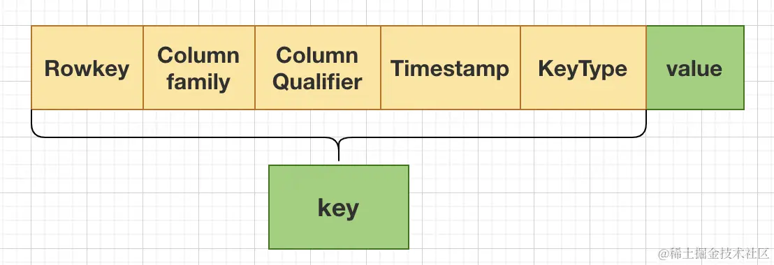 从上图可以看出一些长度是固定的值,所以把key做一些简化,然后重点看下这些内容的具体含义。Key由RowKey(行键) + ColumnFamily(列族)+ Column Qualifier(列修饰符)+ TimeStamp(时间戳--版本)+ KeyType(类型)组成,而Value就是实际上的值。