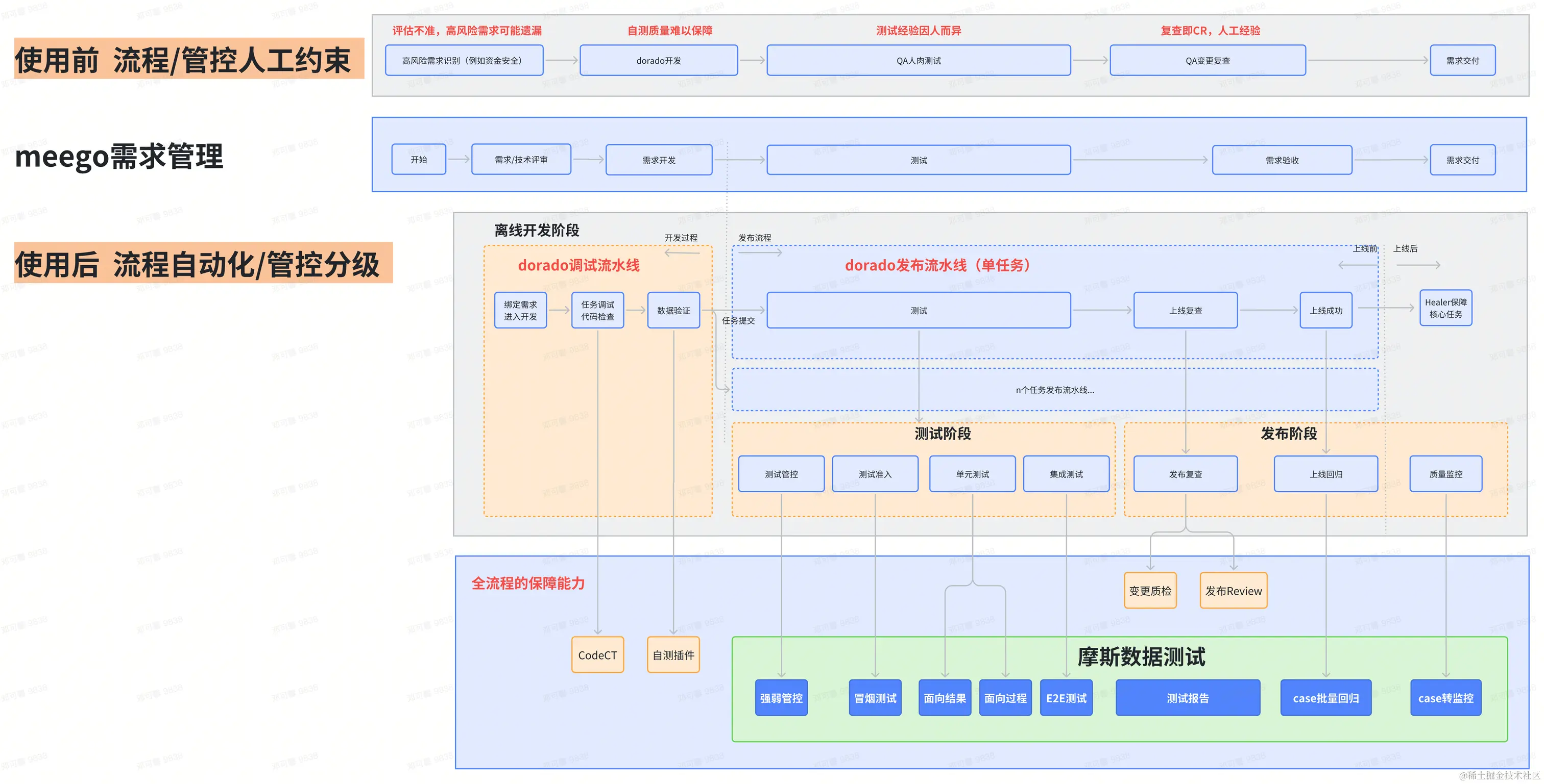 使用后:全自动化的分级保障,从开发、自测、QA 测试、发布过程全自动化模式。