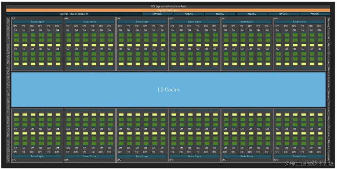 看看最新的Ada架构,也就是4090这一代,这是完整的管线图,密度相较于之前大大提高,仍然是微架构体系。