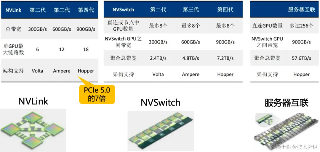 第二个图就是 NVSwtich 的数据,因为它在训练时数据非常大,一个卡的数据存不下来,就必须用卡间通信,卡间带宽是多卡互联技术在大模型训练时会遇到的非常大的瓶颈。