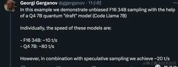 llama.cpp 的作者 gg 实测,通过投机采样可以提升至原来 2 倍的推理速度。