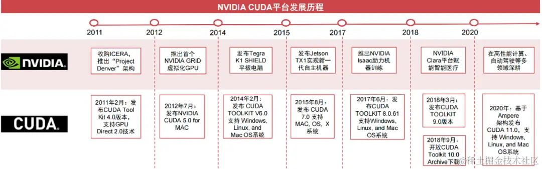 这是是英伟达的硬件架构变迁图。随着2007年英伟达推出 CUDA 1.0版本,使其旗下所有 GPU 芯片都适应 CUDA 架构: