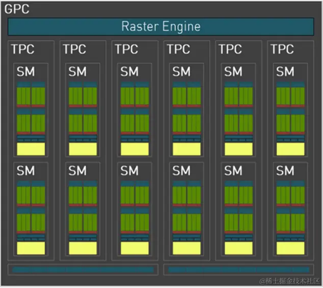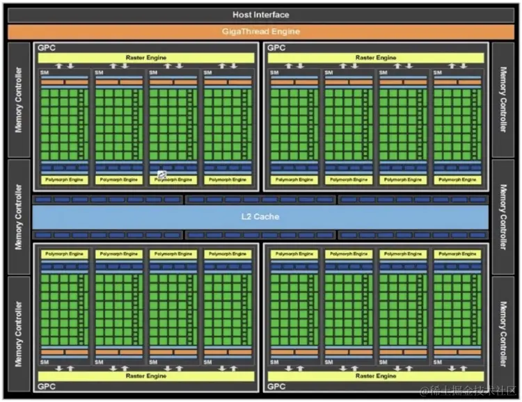 目前的GPU基本使用微架构设计,以最早的Fermi架构开始(2010年),那时候一个GPU是由4个GPC(图形处理簇 Graphics Processing Clusters)、16个SM(流多处理器,Stream Multiprocessors )以及512个CUDA Core(向量运行单元)组成的,这是GPU的特性。