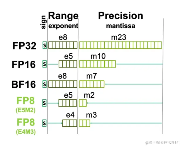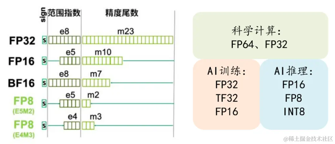 按照计算场景所要求数据精度和表示范围,可以选择不同的浮点数类型。常见的浮点数类型有 64 位的双精度 double(FP64)、32 位的单精度 float(FP32)、16 位的半精度 half、以及四分之一精度的 FP8 等。其中,半精度在指数位和尾数位的分配上又可以细分成:bf16 和 FP16。同样 FP8 也可以细分成 E5M2,E4M3。