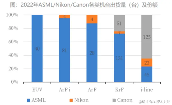 除了FAB厂之外,最最关键的瓶颈就是光刻机了,可以看见,ASML占据了先进光刻机的绝大部分市场。特别是EUV技术(极紫外光刻技术),目前只有ASML能做到,只有这个技术,才能光刻出10nm以下制程的芯片。