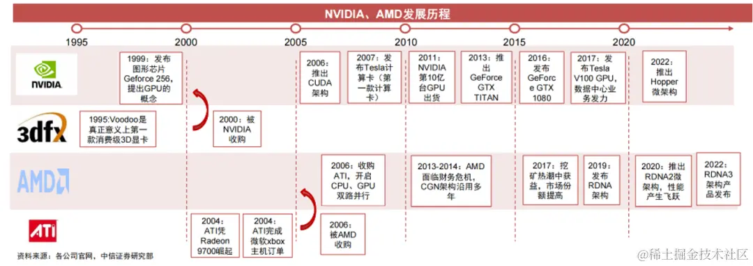上图为GPU发展过程图,可以看出3dfx早期发展迅猛,2000年以不到一亿美金的估值被英伟达收购,ATI是AMD显卡的前身,2006年被AMD收购,所以后期基本为英伟达与AMD双雄争霸。