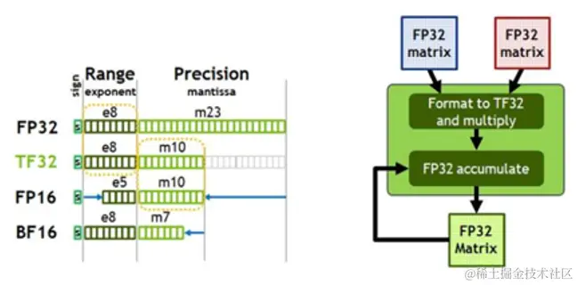 这代架构对比之前的 Turing 架构(2018年),其 Tensor Core 主要支持了三个新的数据类型,FP64,TF32,和BF16。其中 TF32 没有 32 位,只是阉割了精度尾数,只有 18 位,AI 行业中 TF32 用得并不广泛。但 BF16 就非常关键了,BF16 就是将 FP16 的指数位和精度位做了偏移,正是因为这个偏移使得 BF16 在 AI 训练的展示中范围大大扩大,所以 BF16 也是现在很多 AI 模型所训练的主流选择。