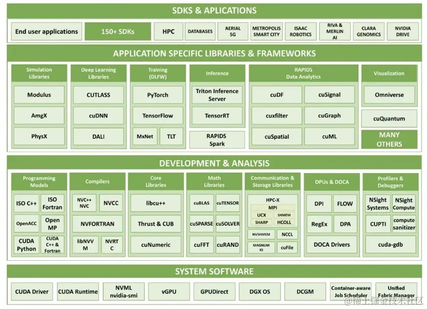 CUDA生态和价格也是英伟达的最核心竞争力,也是英伟达万亿市值的关键因素之一。英伟达投入了一万以上的工程师在发展这个体系,基本上把人工智能里的大部分场景都做了深度优化。英伟达长期投入CUDA生态建设,为开发者服务,建立好了一系列的开源生态。