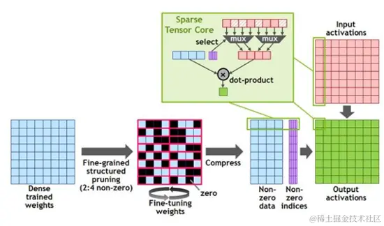 除此之外,还支持了结构化稀疏,稀疏矩阵是在矩阵中大量都为 0(或者接近于0),能够通过硬件快速计算出来的矩阵。Nvida 的 GPU 专门为稀疏矩阵做了优化,使得相同规模的稀疏矩阵的计算速度是稠密矩阵的 2 倍。