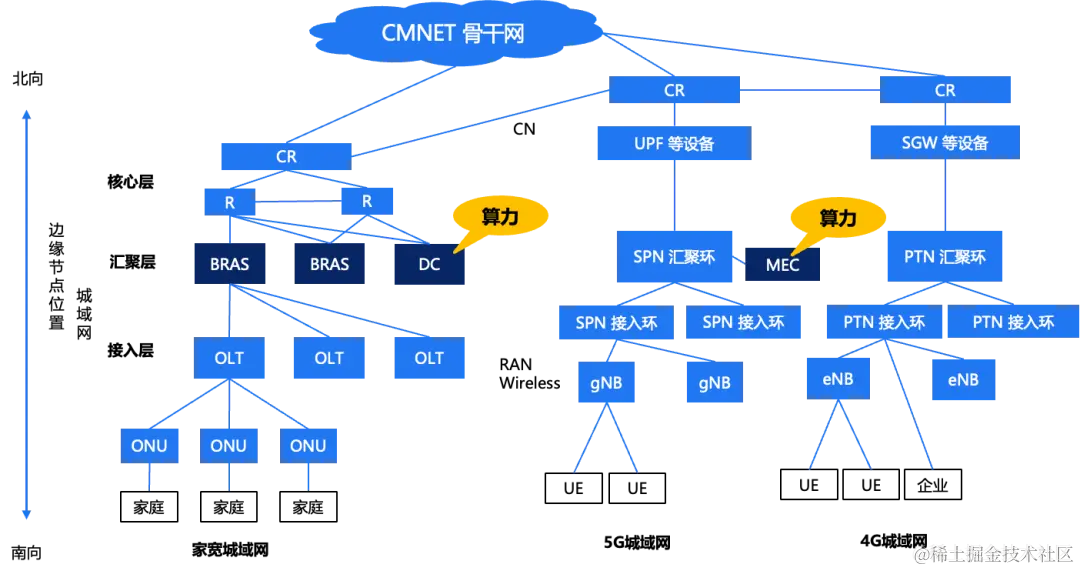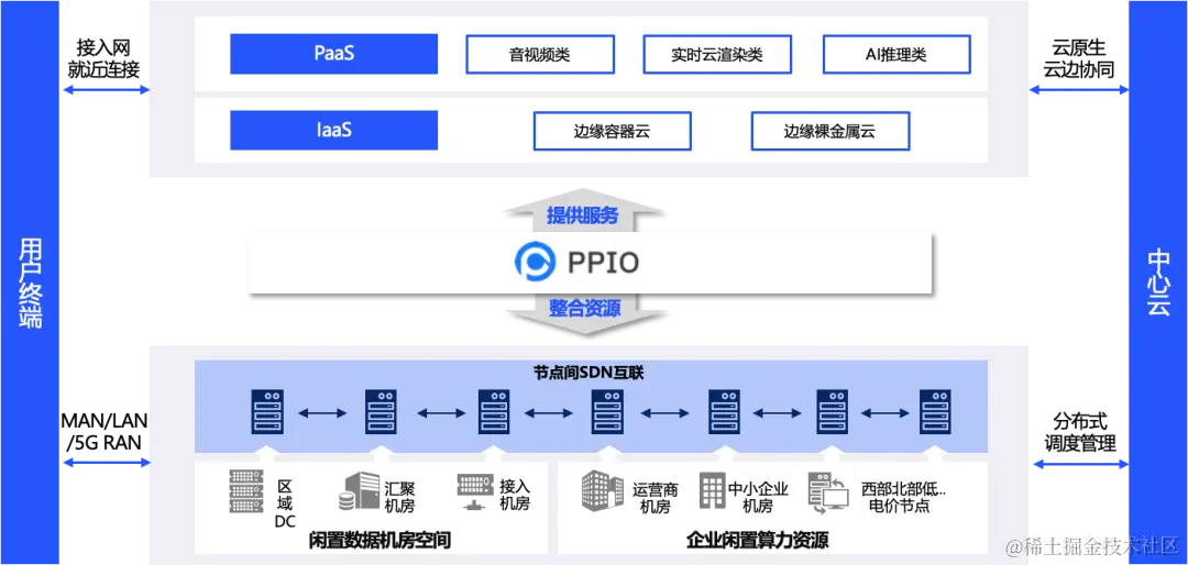 其次从城域网角度看,这是运营商北向-南向的图,PPIO也把算力部署在了汇聚层的DC。左边的图是固网,右边是移动网,在移动网中算力部署在MEC。