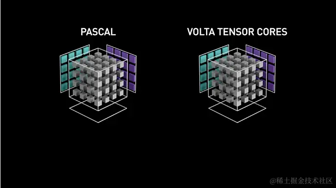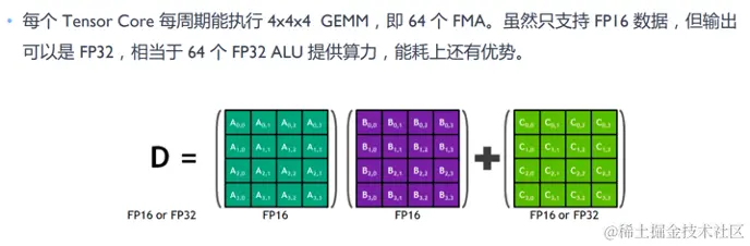 NVIDIA 为了进一步加速“加乘运算”,在 2017 年推出了 Volta 架构的 GPU,从这个架构开始 Tensor Core被引入。它可以在一个时钟周期完成两个 4×4x4 半精度浮点矩阵的乘法(64 GEMM per clock)。