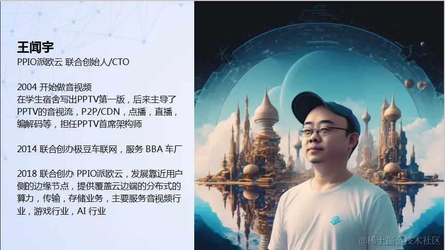 PPIO派欧云的联合创始人和CTO王闻宇,2004年就开始做音视频,曾是PPTV 的联合创始人并担任首席架构师一职,主导了P2P、直播、点播、编码等一系列产品。PPTV被出售后,转投车联网公司智能支撑领域。2018年重回音视频领域创办PPIO派欧云,目标在于把对技术以及资源的理解打造成服务,并服务于整个音视频行业以及游戏领域与AI领域。