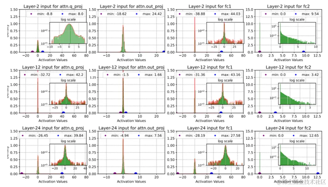 有学者针对这一问题专门做了验证,如下图,他把模型推理过程中的激活值都提取了出来,分别在第2层、第12层、第24层做了采样。我们可以看到无论是在 attention 阶段还是在 FFN 阶段,各个模型层的激活值都有显著的近似正态分布的性质(当然这里面也会有一些极少量的离群值,这些值可以在具体的量化方案中做特殊的处理)。