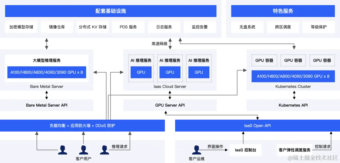 此外,我们也为客户提供负载均衡、应用防火墙和DDoS防火等线上业务上必须的核心功能。为了方便客户使用算力资源,我们不仅开发了基于界面的控制台,也提供了开放 API 供客户进行二次开发和系统集成。通过这个 API 客户可以很方便地控制GPU 裸金属,GPU 服务器,GPU容器三种资源。