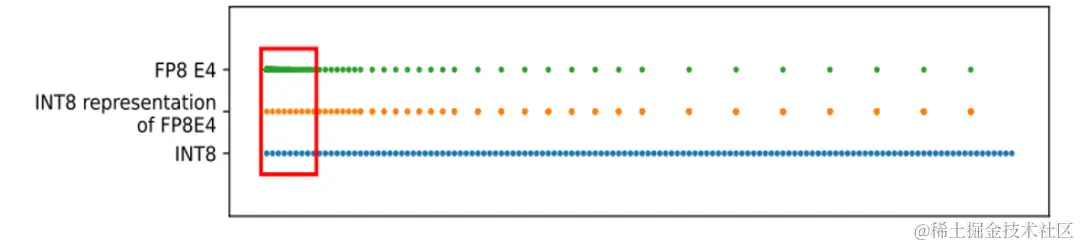 ●FP8 的值分布呈现非均匀分布,它在绝对值较小的区域比较密集,而在绝对值较大的区域表现为稀疏;