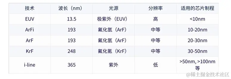 不用光刻技术的对照表: