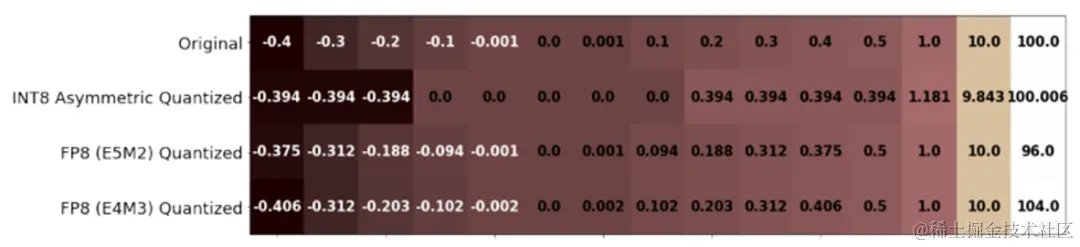 下图是一个 FP8 和 INT8 量化后效果的具体对比,可以看出原数据经过 INT8 量化后许多 -0.1、-0.001 的数据都被量化为 0 了,但用 FP8 量化时,无论是 E5M2、E4M3,这些较少数值的数据基本都被很好地保留了。