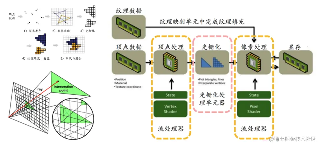 GPU早期一般为了3D渲染而设计。从计算机图形学的角度,GPU将三维事件的点阵通过矩阵变化投影到二维平面上,这个过程叫做光栅化,最终在显示器上结果。GPU的能力基本上是顶点处理、光栅化、像素处理等,这个过程包含大量的矩阵计算,刚好利用了GPU的并行性。