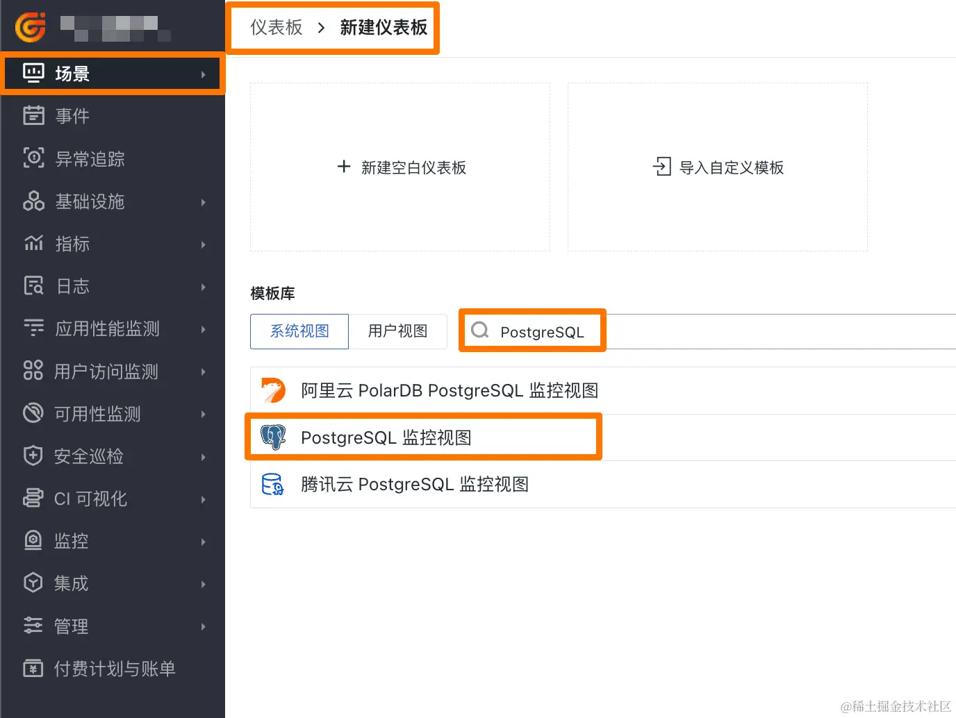 登录「观测云控制台」-「场景」-「仪表板」-「新建仪表板」-「系统视图」,搜索“PostgreSQL”,添加即可。