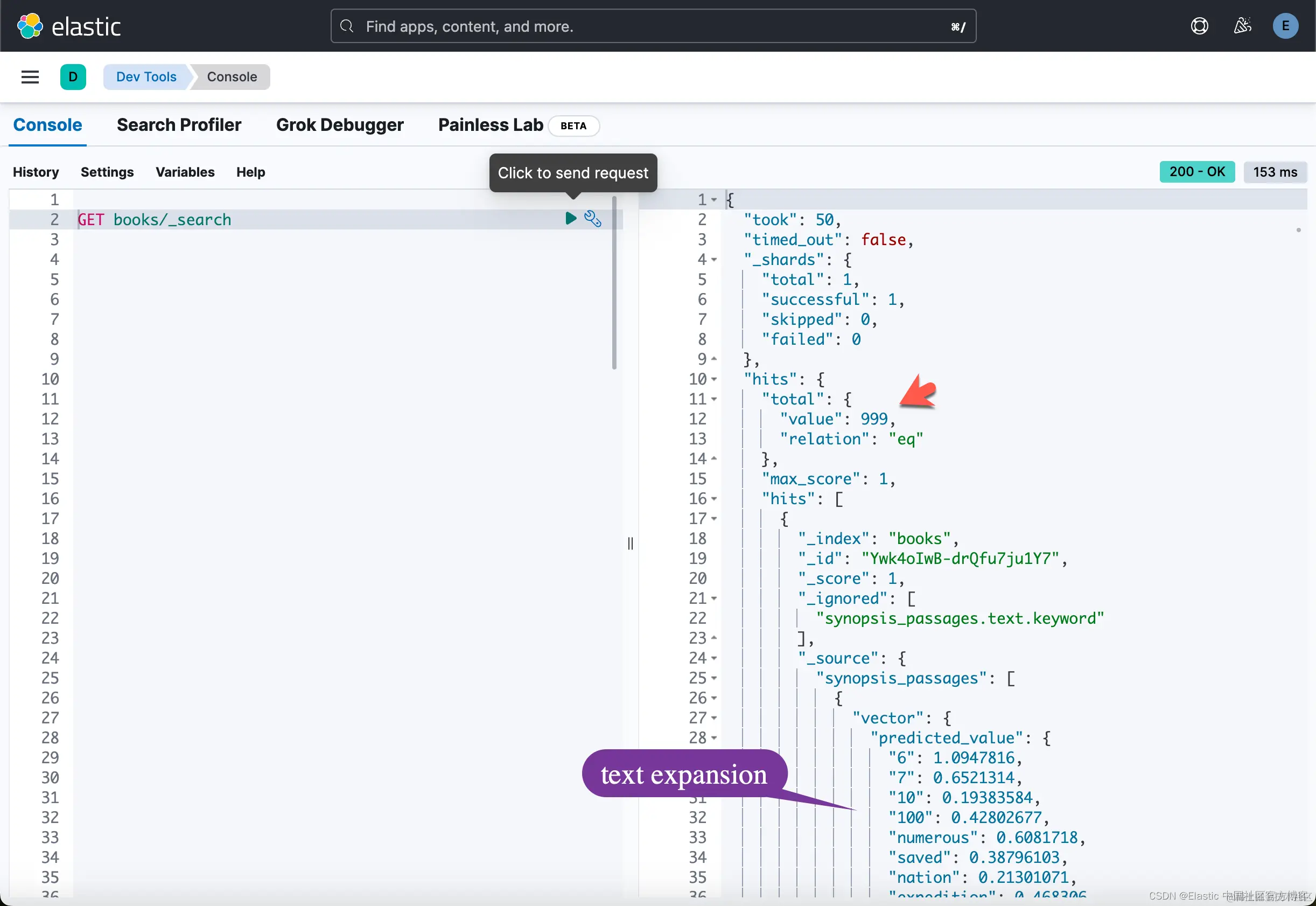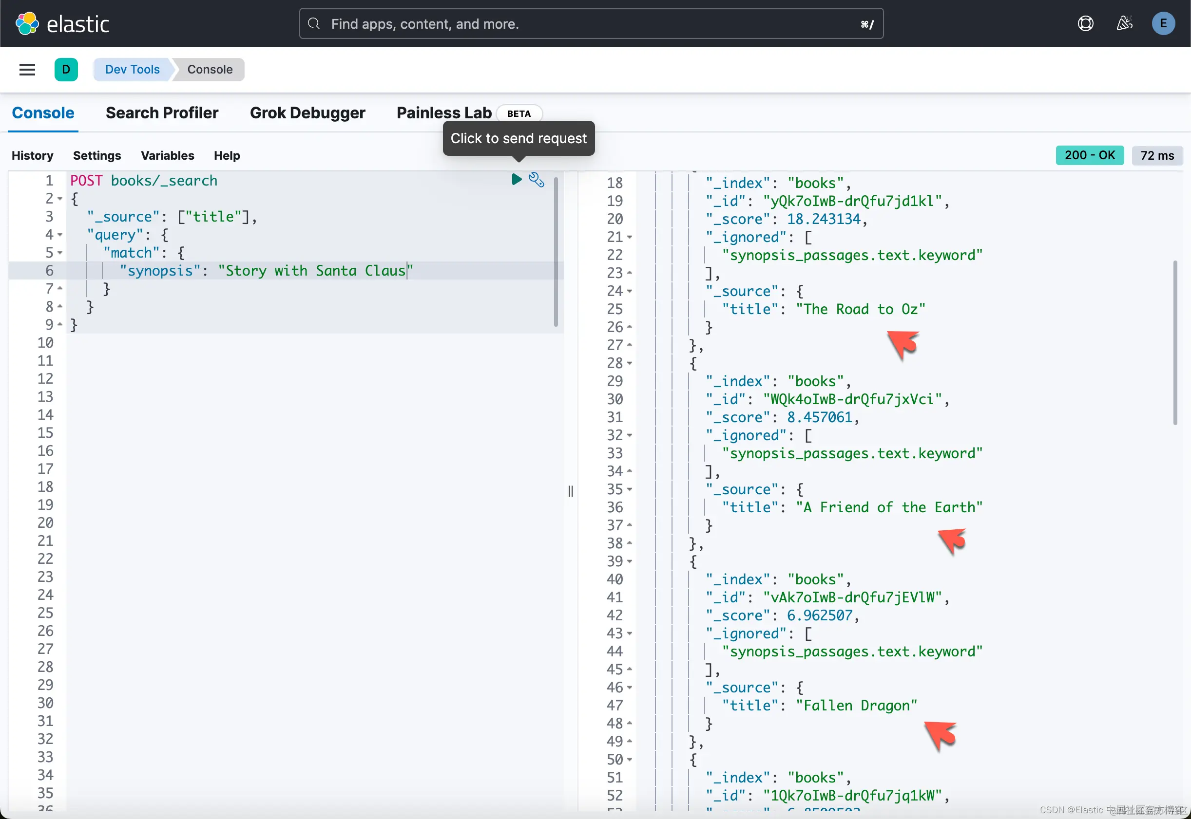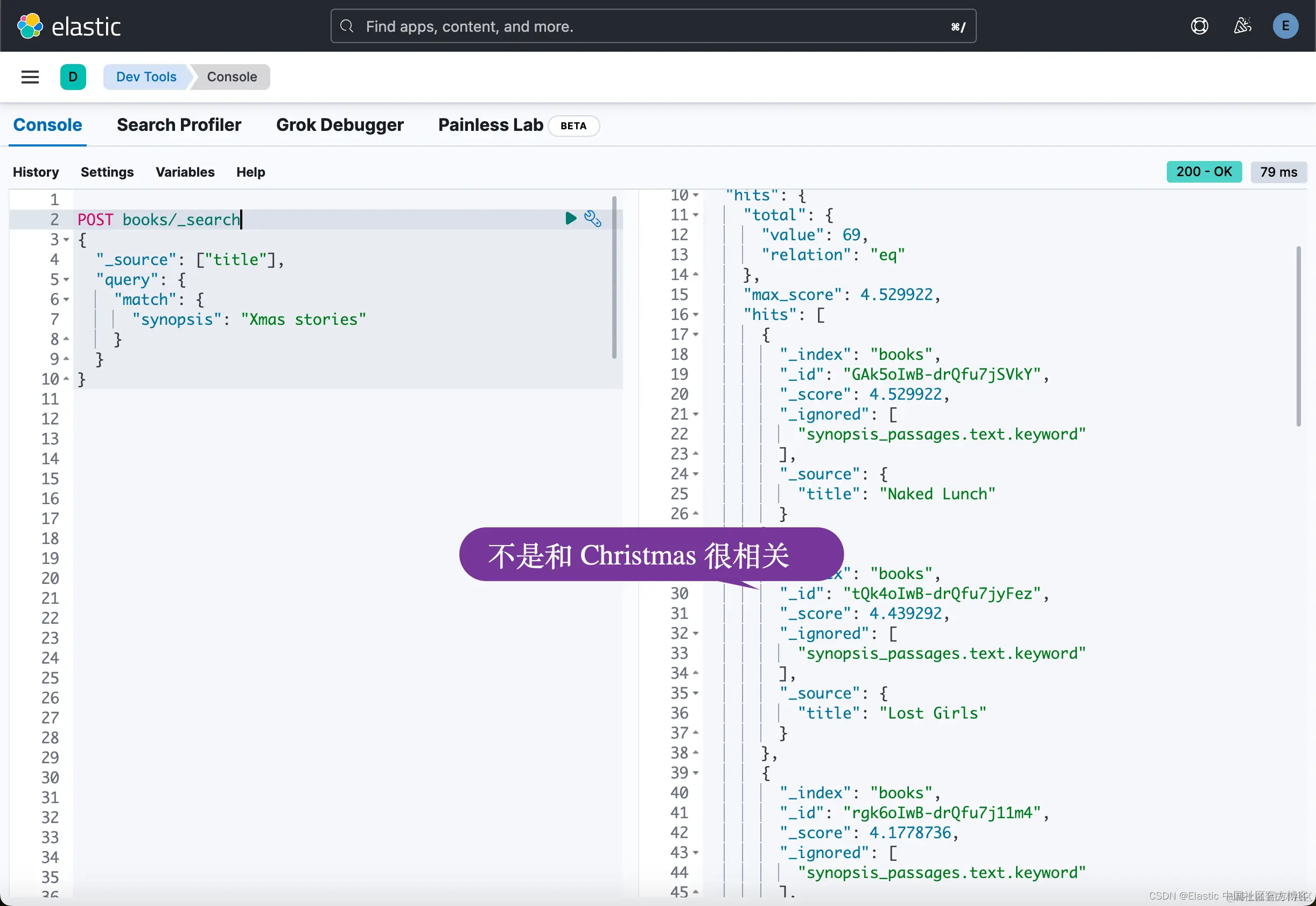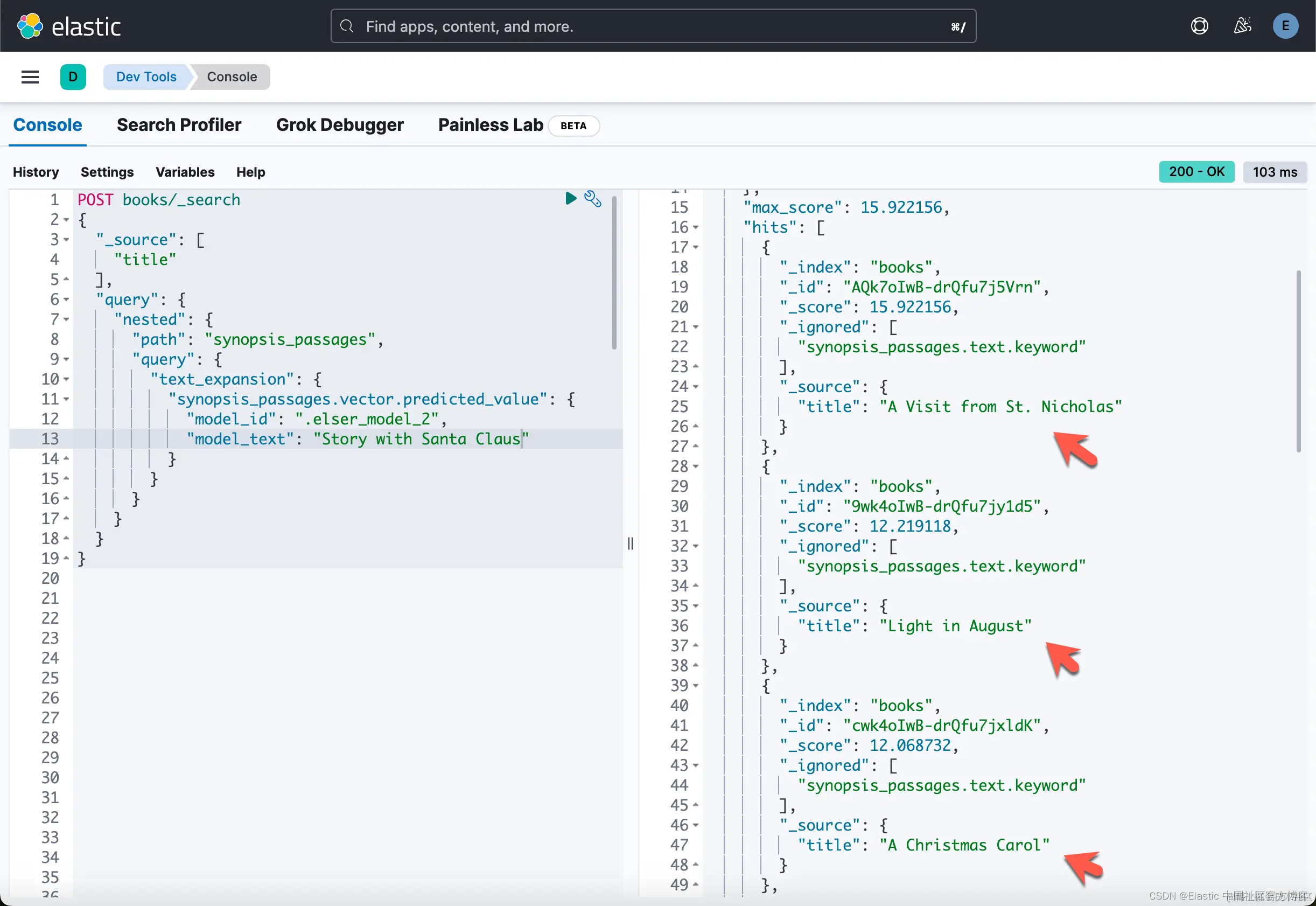 我们现在已经准备好进行有趣的部分:测试一些查询以查看我们得到的结果。 这里的一件很棒的事情是,Elasticsearch 支持使用相同索引的关键字搜索和语义搜索,只要数据已正确索引即可,这里就是这种情况。 我们已将概要索引为文本以及稀疏向量数组。