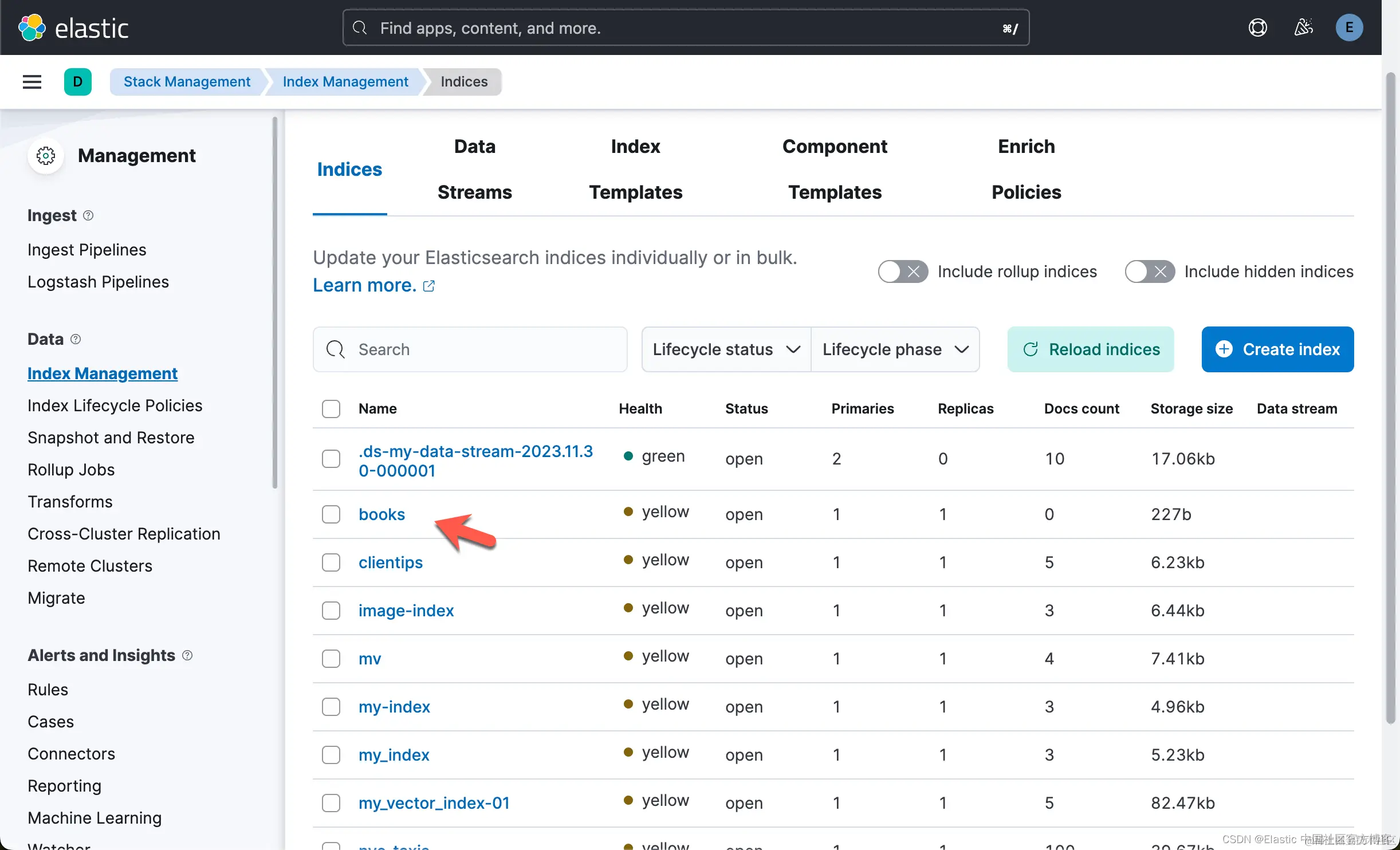 我们可以在 Kibana 中查看到最新的 books 索引: