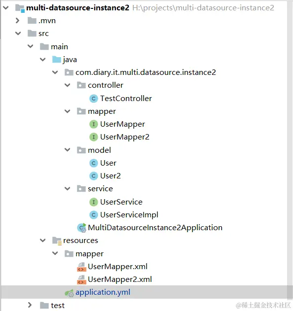 本次案例涉及到的代码比较多,因此文章只贴出部分,全部案例代码已经上传到 Gitee,需要者可直接访问:【SpringBoot 结合 MyBatis 整合多数据源】,项目结构如下:
