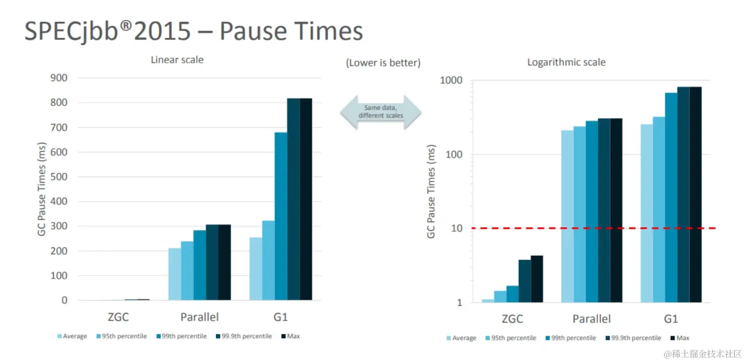 如上图所示是ZGC垃圾回收器和Parallel和G1等垃圾回收器相比较起来的GC Pause,可以发现其GC 停顿已经降低到的很客观的程度,并且这个GC停顿的时间还是可以自主进行配置的。
