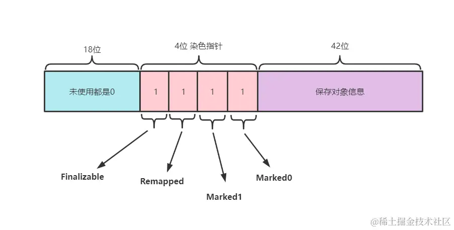 染色指针简单来说就是一种将额外少量的垃圾标记信息(颜色信息)存储在对象指针上的技术,在64 位操作系统中,对象指针的长度也是64位,染色指针的结构图如下: