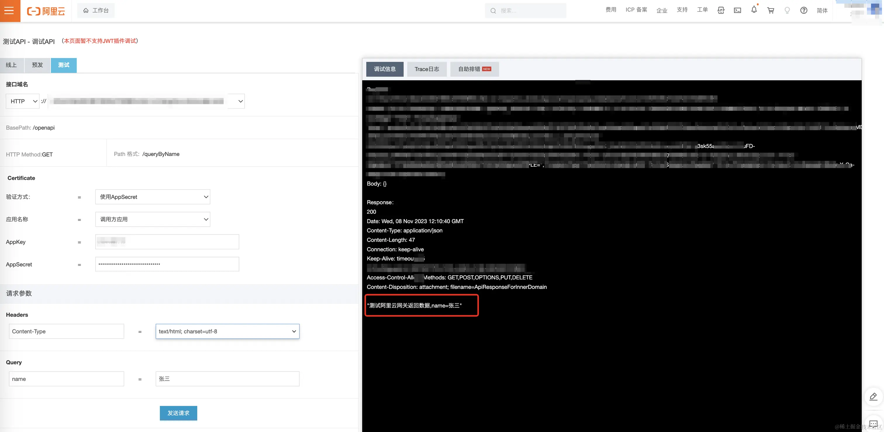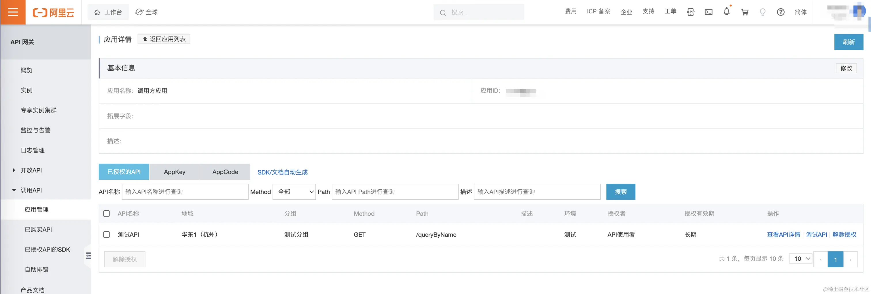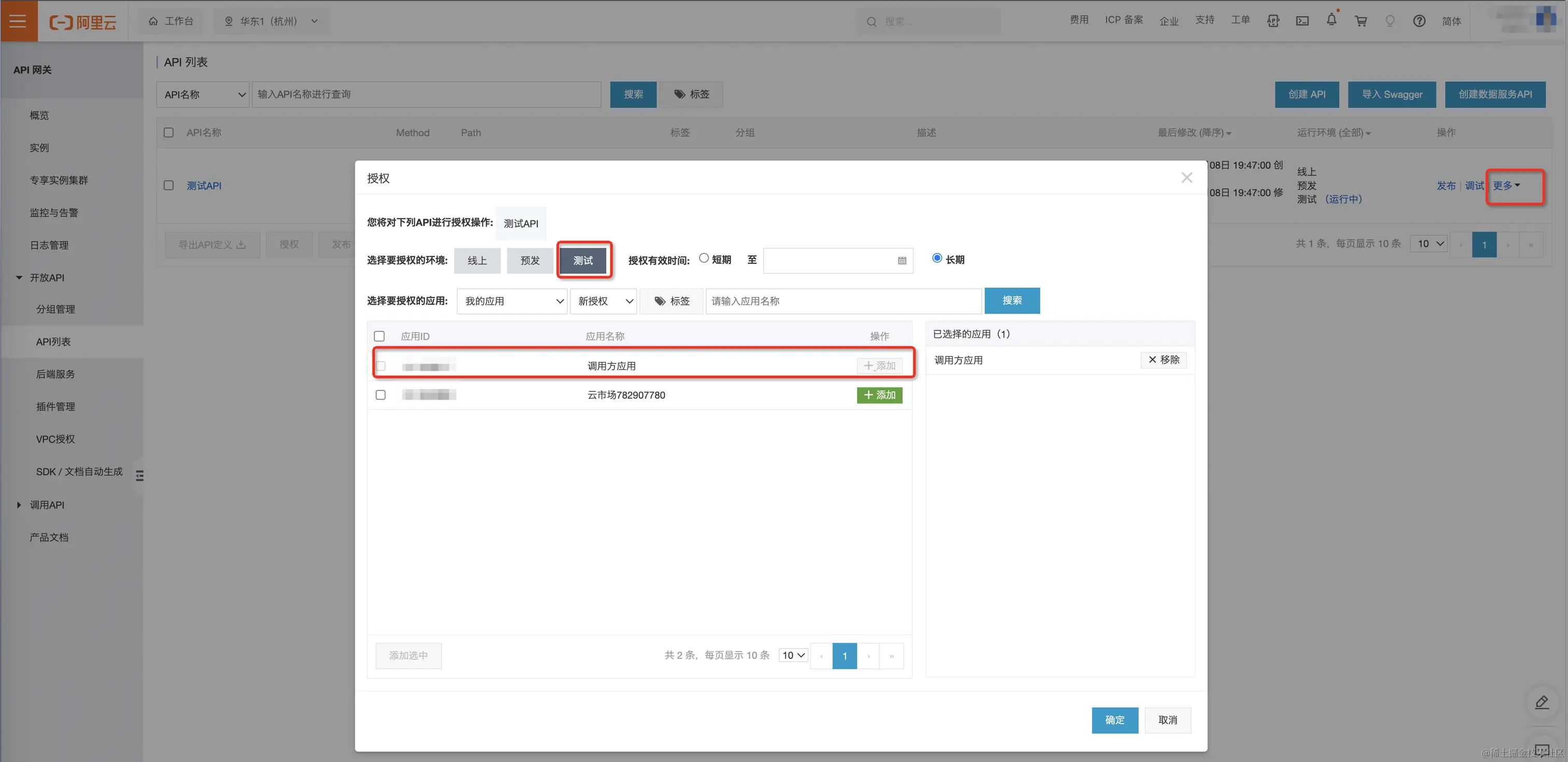 授权给应用后,当前API就和应用建立了联系,有一个稍微麻烦的地方,测试、预发、线上需要分三次授权。授完权,应用在调用API的时候,使用对应ak/sk或appCode就可以调用这个API了。