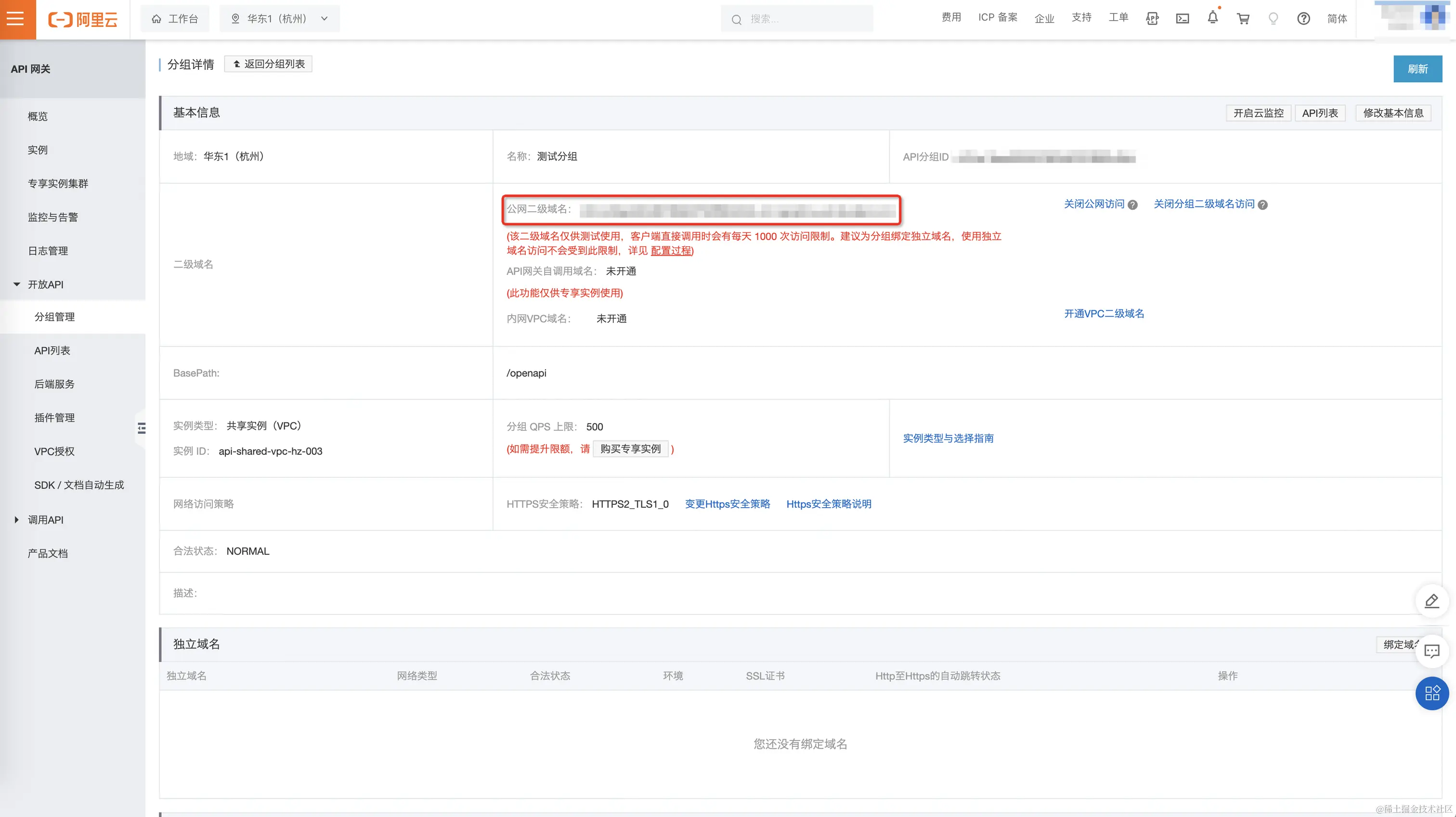 API分组ID,并且会提供一个公网二级域名,正常来讲这个域名就已经可以调通接口了,但是这个二级域名仅供测试使用,客户端直接调用时会有每天 1000 次访问限制。 我的做法是根据自己的域名开一个二级或者三级域名,通过CNAME解析到阿里云的这个公网二级域名,这样就不会有次数限制了。 弄好域名解析后,需要到当前分组独立域名这里配置一下,如下