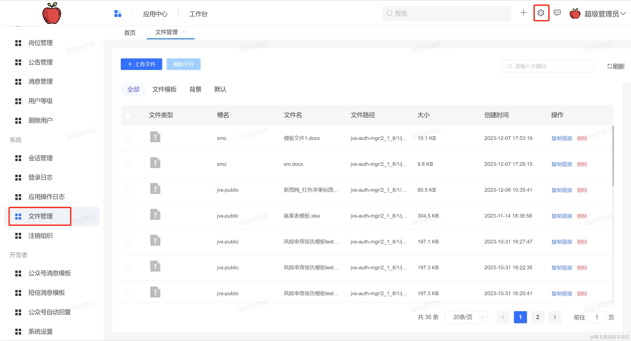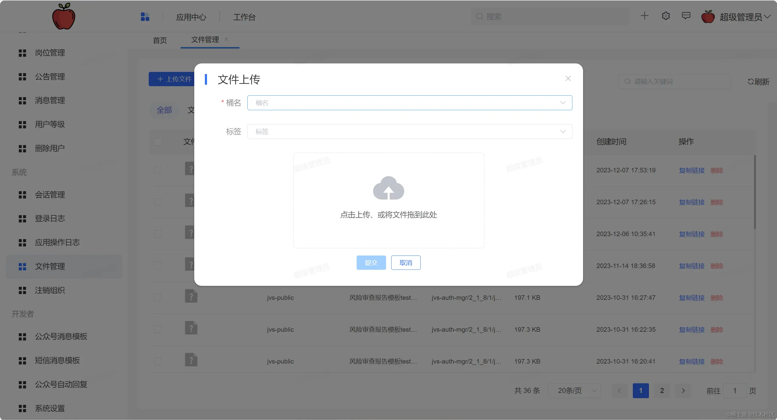 管理员登录系统进入平台管理-文件管理点击【上传文件】,输入桶名和标签,并将设置好的文件模板docx格式上传并点击【提交】。