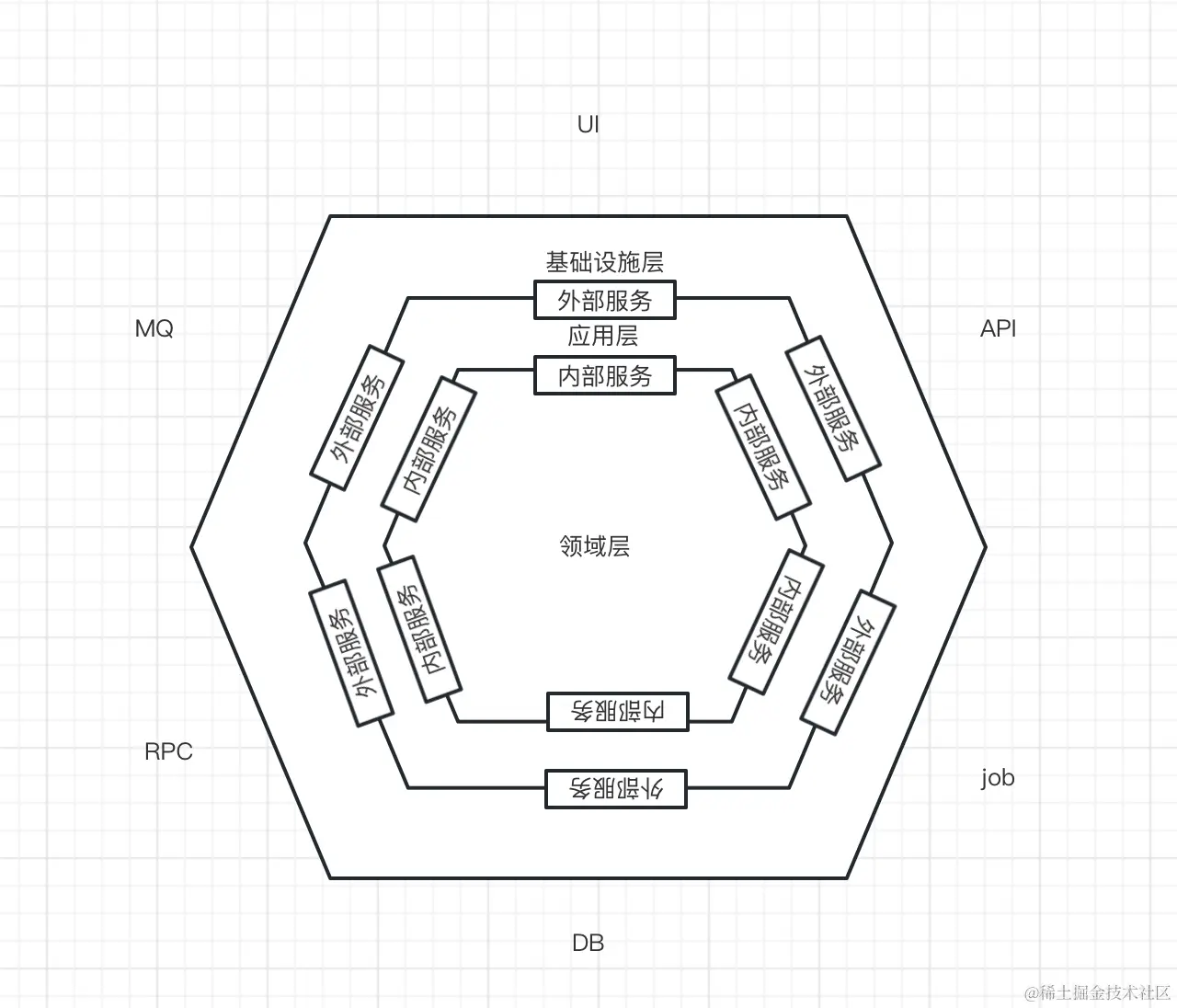 我们结合对应用层、领域层和基础设施层进一步的理解再加上反转后的应用架构,便可以得到六边形架构: