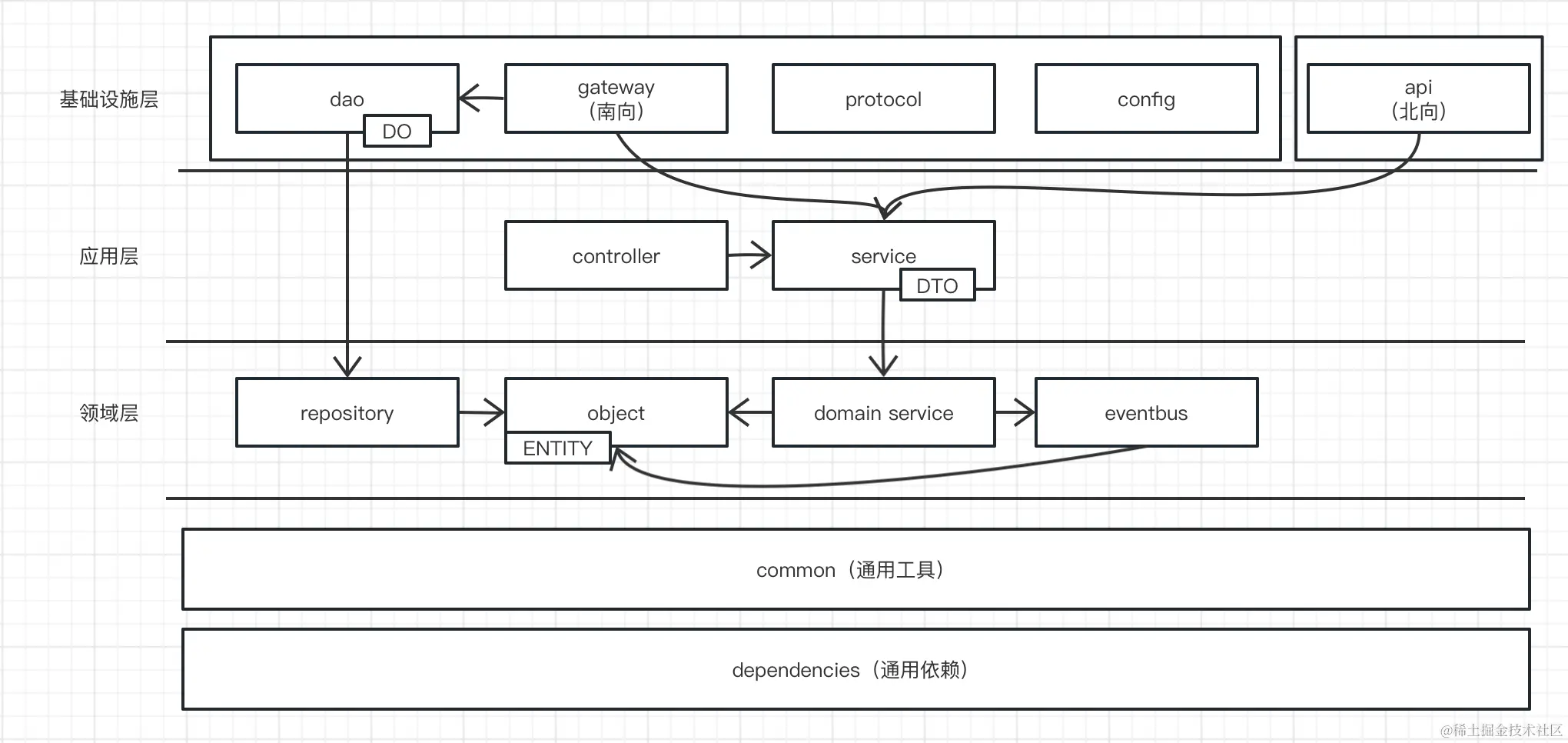 | 代码层级 | 基础设施层 | 领域层 | 应用层 |