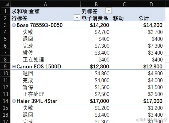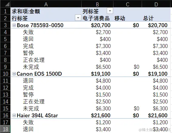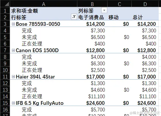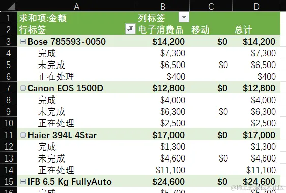 此时的数据透视表将如下所示:已经出现了”未完成“状态的订单。