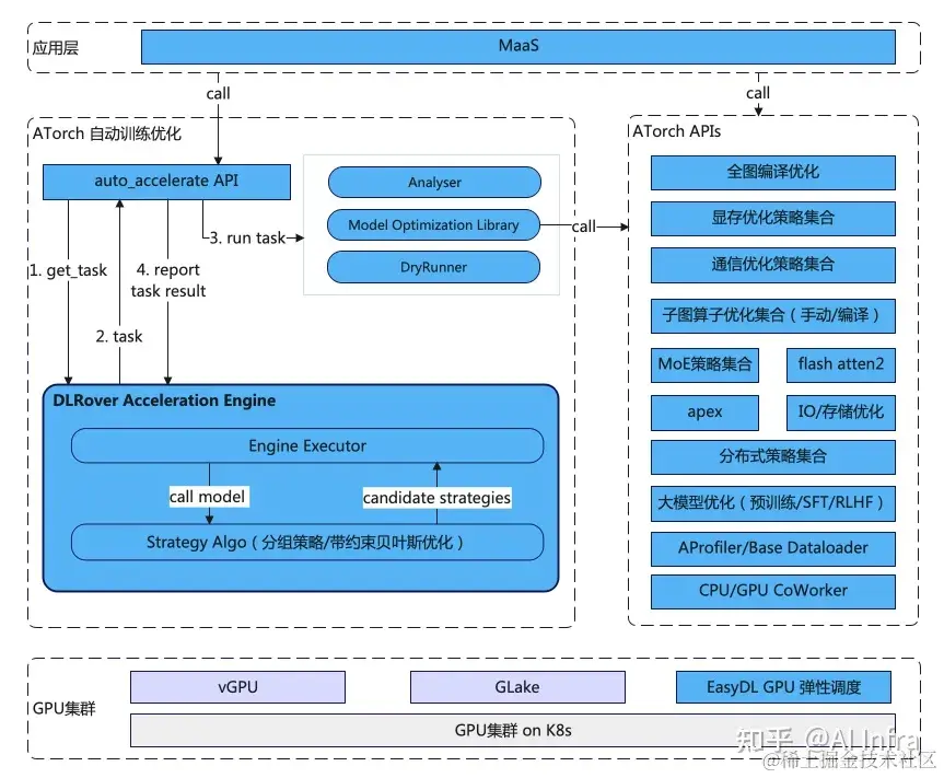 - 核心层是ATorch的主要代码,这里我们定义了优化策略的统一接入和表达,保障开源方法和自研策略统一管理,同时也包含了自动策略最优策略组合的功能。
