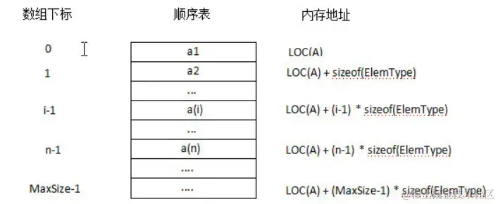 假设线性表 L 存储的起始位置为 LOC(A) ,sizeof(ElemType) 是每个数据元素所占用存储空间的大小,则表 L 所对应的顺序存储如下图: