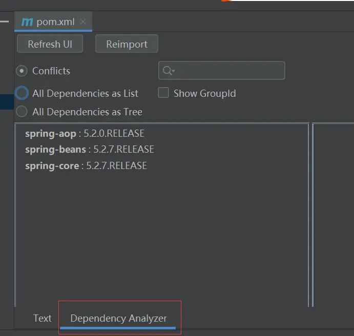 maven helper 插件安装成功,点开 pom.xml 会发现多了一个 Dependency Analyzer 视图,如下
