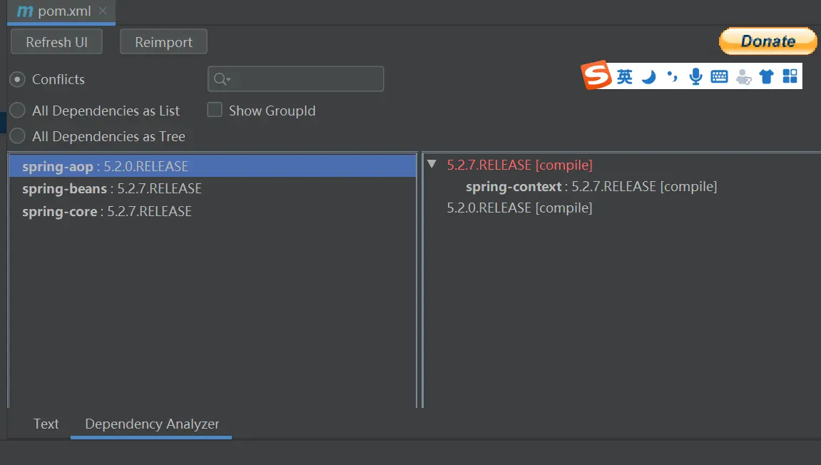 其中 omitted for duplicate 表示有 jar 包被重复依赖,最后写着 omitted for conflict with xxx 的,说明和别的 jar 包版本冲突了,而该行的 jar 包不会被引入。比如上面有一行最后写着 omitted for conflict with 5.2.7.RELEASE,表示 spring-core 5.2.0 版本不会被项目引用,而 spring-core 5.2.7 版本会被项目引用