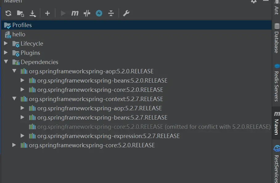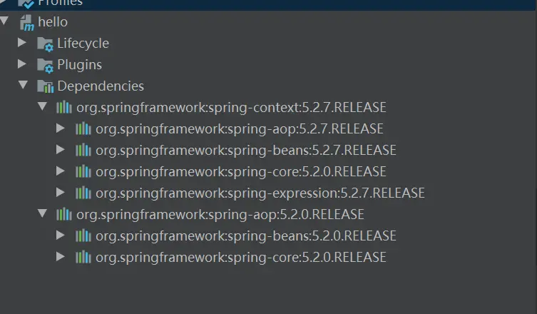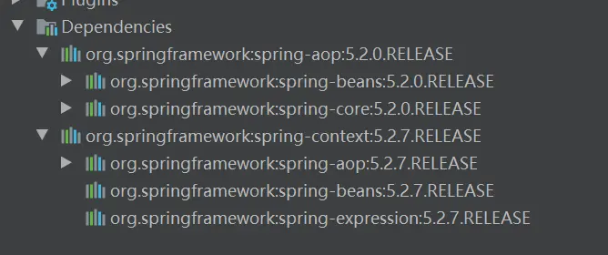 通过查看依赖树,我们知道项目会引用 5.2.7.RELEASE 的 spring core jar 包,而不会引用 5.2.0 的 jar 包,如果我们想用 5.2.0 版本的 spring core 包,我们该如何做?
