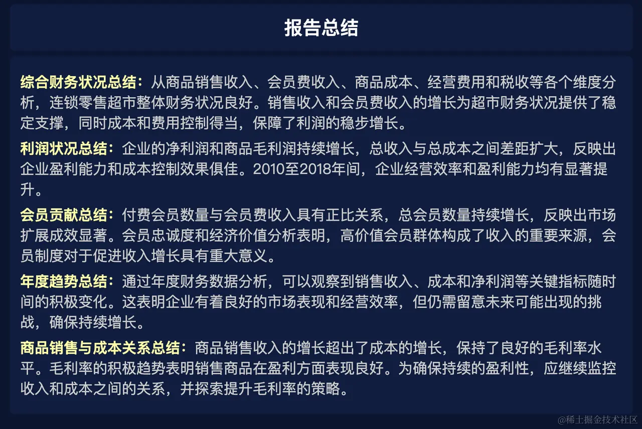 当所有阶段的数据分析都完成后,还会有一位报告总结师,会对整个报告做个总结,得出本次报告的最终结论: