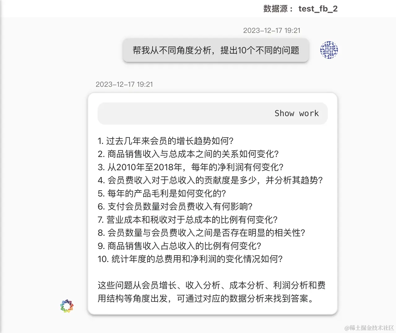 宛如身边有一个可随时提问的 业内顶尖的数据分析团队,只要你问数据分析问题,它就能给你“答”出来。(下面是用的一个数据集进行的测试的部分截图)