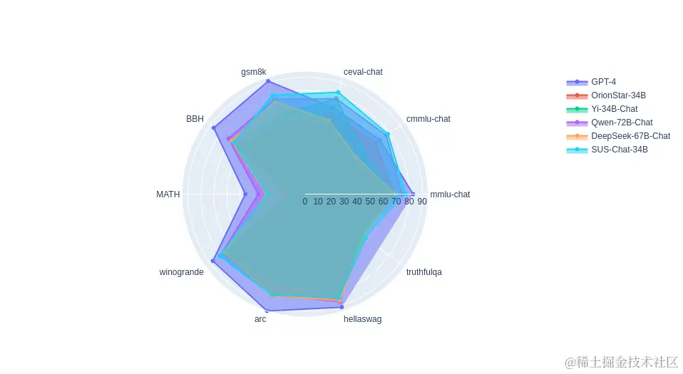 在多个基准测试中,SUS-Chat-34B展现了其在知识和思维能力方面的先进表现。在MMLU, CMMLU, C-Eval等测试中,该模型取得了领先的成绩,特别是在常识性推理能力和幻觉方面的表现令人瞩目。