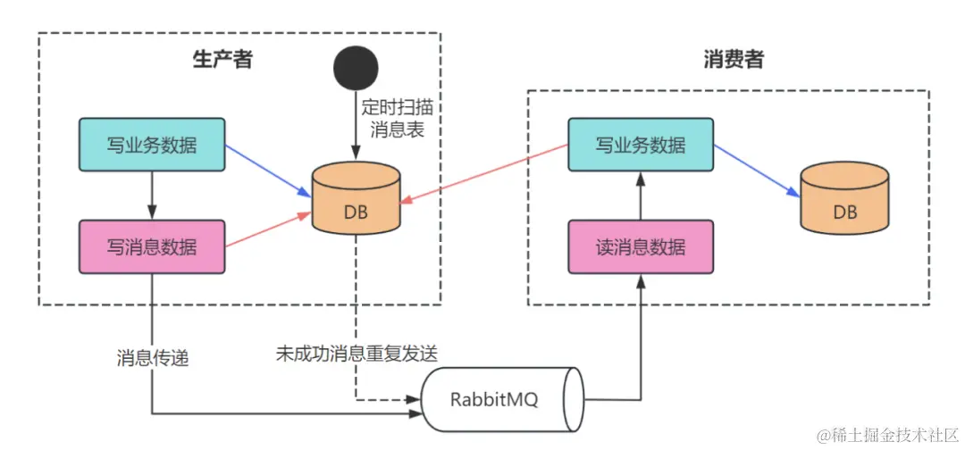 - 本地事务和消息表的写入操作在同一个数据库事务中完成,这样可以保证要么都成功,要么都失败,从而保证了数据的一致性。