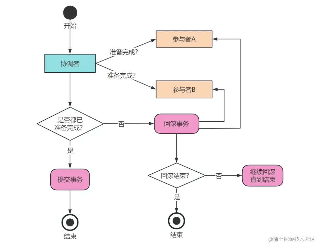 如果有任何一个参与者在准备阶段没有准备好,那么协调者会通知所有参与者回滚事务。