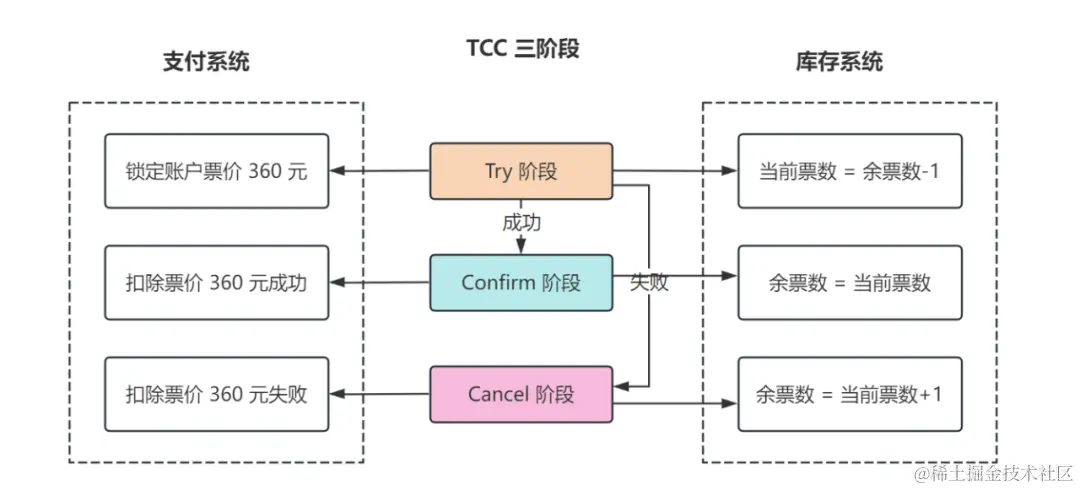 假设我们买一张从深圳到北京的火车票,票价为 360 元,TCC 分为这三个步骤: