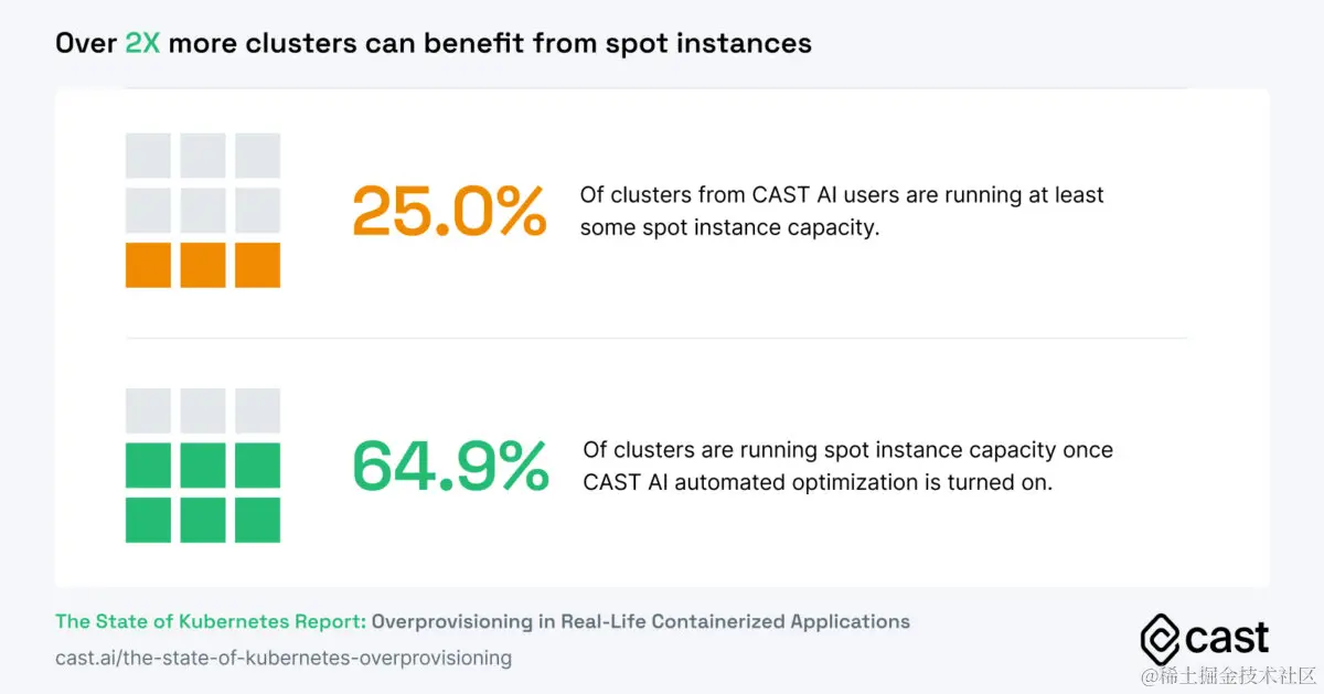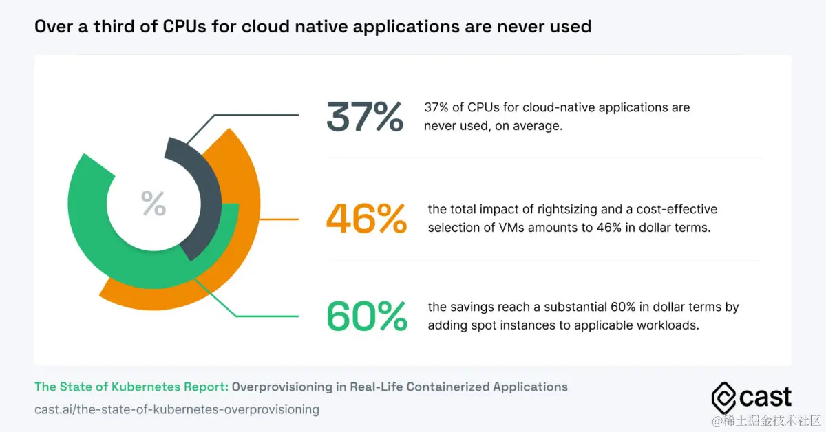 对于集装箱应用来说,减少浪费的解决方案是可以实现的。在 CAST AI,我们看到公司每月通过消除过度配置而减少近 50% 的云支出,并在组合中添加现货实例,使云支出额外增加 10%。12