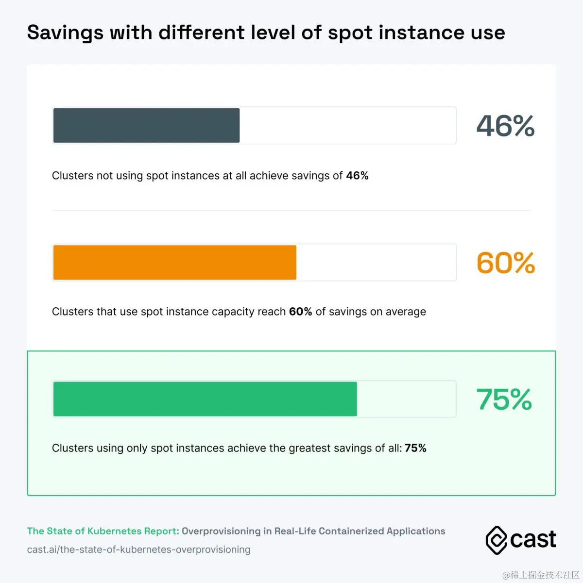 仅 Spot 节省的成本远高于我们之前 2022 年第一季度的 Kubernetes 状况分析中显示的水平。届时,“全现货”将影响成本 65%。