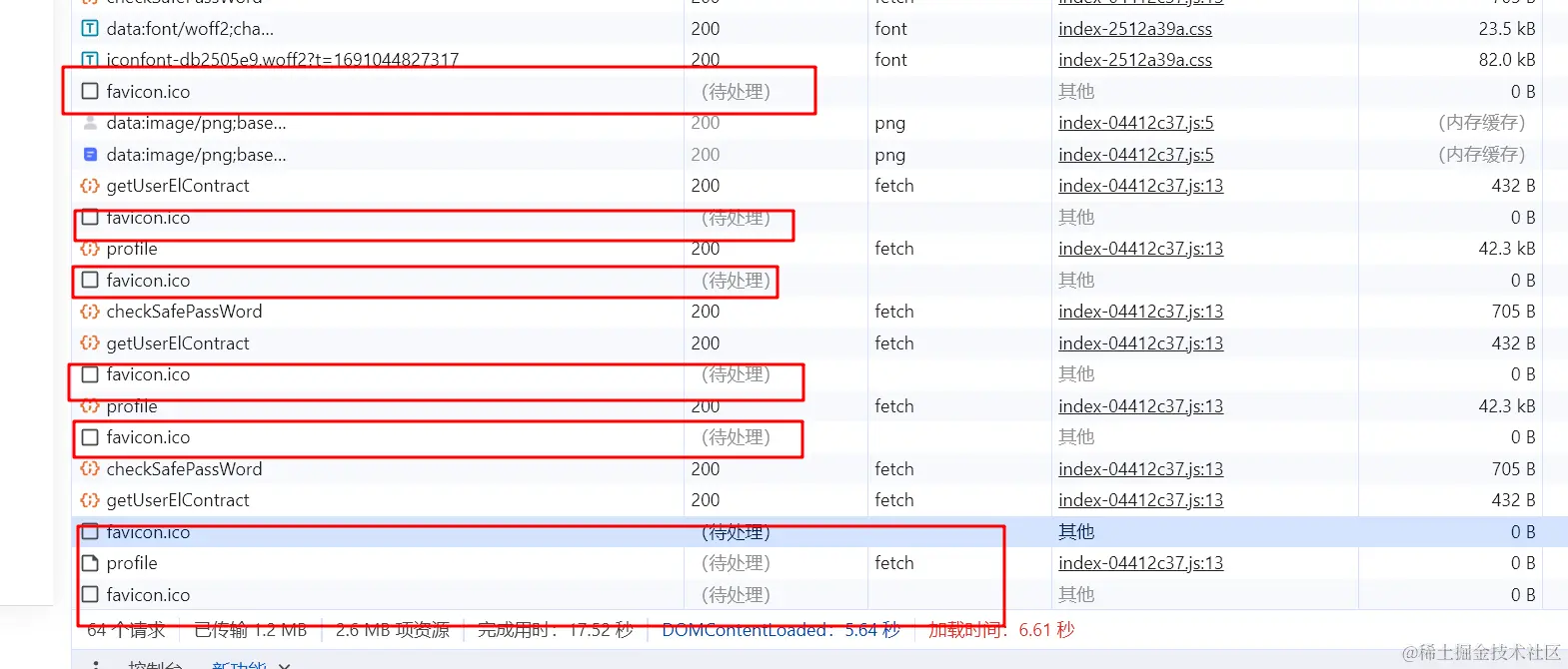 由于项目本身没有设置ico图标,浏览器会自动的发送一个请求。以获取网站的图标。如果该请求未能及时完成,浏览器会一直保持请求状态,并在每次页面切换时重新发送请求。浏览器通常对同一个域名下的并发请求数量有限制,当出现多个请求中的 favicon.ico 时,就会达到浏览器对同时进行的请求数量的限制。超过限制的请求会被浏览器阻止从而无法发送到后端。这也就导致真正页面需要的数据在后面排队,页面在mounted里面开启了加载中的loading,但是迟迟拿不到结果就一直处于加载中的状态。至于为什么白屏,是因为有的人直接在页面的顶部写了一个v-if,请求数据到数据之后才会渲染页面。。。